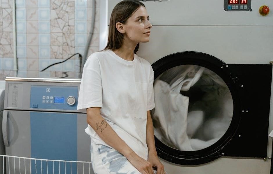 Load laundry according to the washer-dryer’s capacity, as specified in the manual. Ensure balanced distribution to prevent vibration. Overloading can reduce performance and damage the appliance. Separate delicate fabrics from heavier items and avoid overstuffing. Check pockets for loose items like coins or keys to prevent damage. For drying, leave space for air circulation to ensure efficient drying. Follow the recommended load limits for both washing and drying cycles to maintain optimal functionality and extend the appliance’s lifespan.